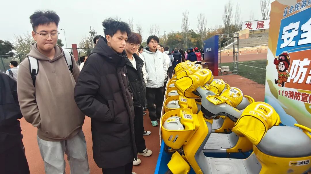 美团共享电动车展区前,同学们听得超认真!工作人员结合真实火灾案例,详细拆解电动车违规充电(如入户充电、飞线充电)、线路老化、电池过度使用等常见隐患的危害与规避方法,还现场演示如何检查车辆电路、识别安全充电区域。原来消防安全不止“火灾发生时”,日常出行的每一个细节都藏着安全密码。