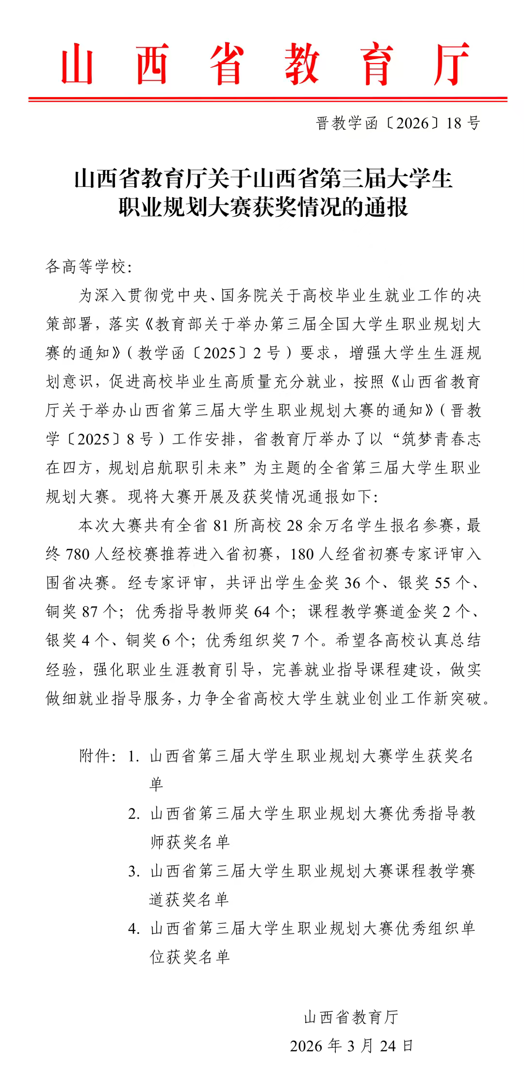 此次获奖是地质与测绘工程系在大学生职业规划大赛省级赛事中取得的一次重要突破,展现出地质与测绘工程系学子良好的职业素养、综合能力与精神风貌,既是对学生个人职业规划能力的充分肯定,也是对地质与测绘工程系就业育人、生涯指导、学风建设工作成效的集中检验。