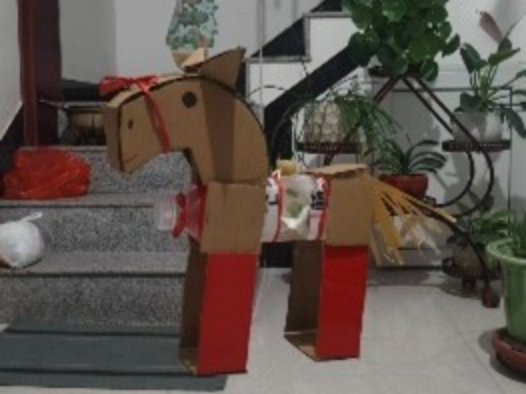 践行可持续设计理念,以快递盒、塑料瓶为核心材料,打造马年主题装置。通过手工重塑赋予废旧物料全新形态,结合烛光光影效果,让“环保小马”承载年味,在团圆之夜传递旧物新生的温暖与美好。我以指尖温度赋予其新生,只为等烛光亮起的刹那,让它驮着旧岁沉淀的微光,踏光而行,奔赴丙午马年的团圆良夜。