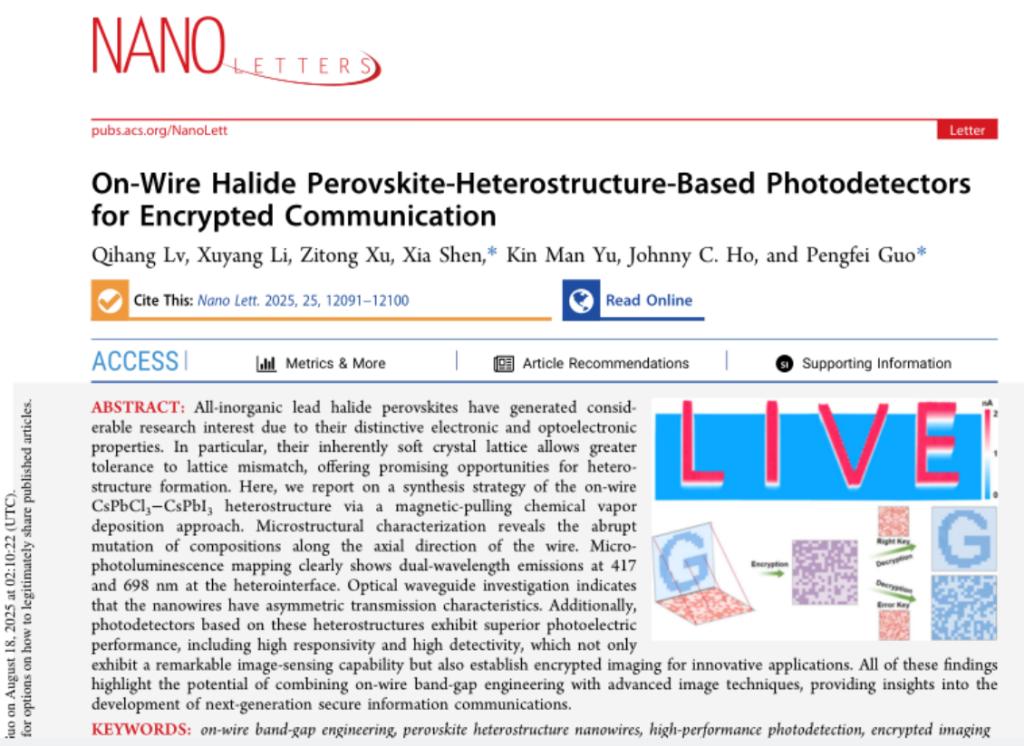 近日,我校强基学院沈霞博士和太原理工大学研究团队合作在纳米光子学研究领域取得重要研究进展,研究成果以“On-Wire Halide Perovskite-Heterostructure-Based Photodetectors for Encrypted Communication”为题,发表在材料物理领域国际顶级学术期刊《Nano Letters》(IF5=9.9)。我校沈霞博士为论文共同通讯作者。美国劳伦斯伯克利国家实验室Kin Man YU教授和香港城市大学Johnny C. Ho教授参与了研究工作。研究工作得到国家自然科学基金资助。