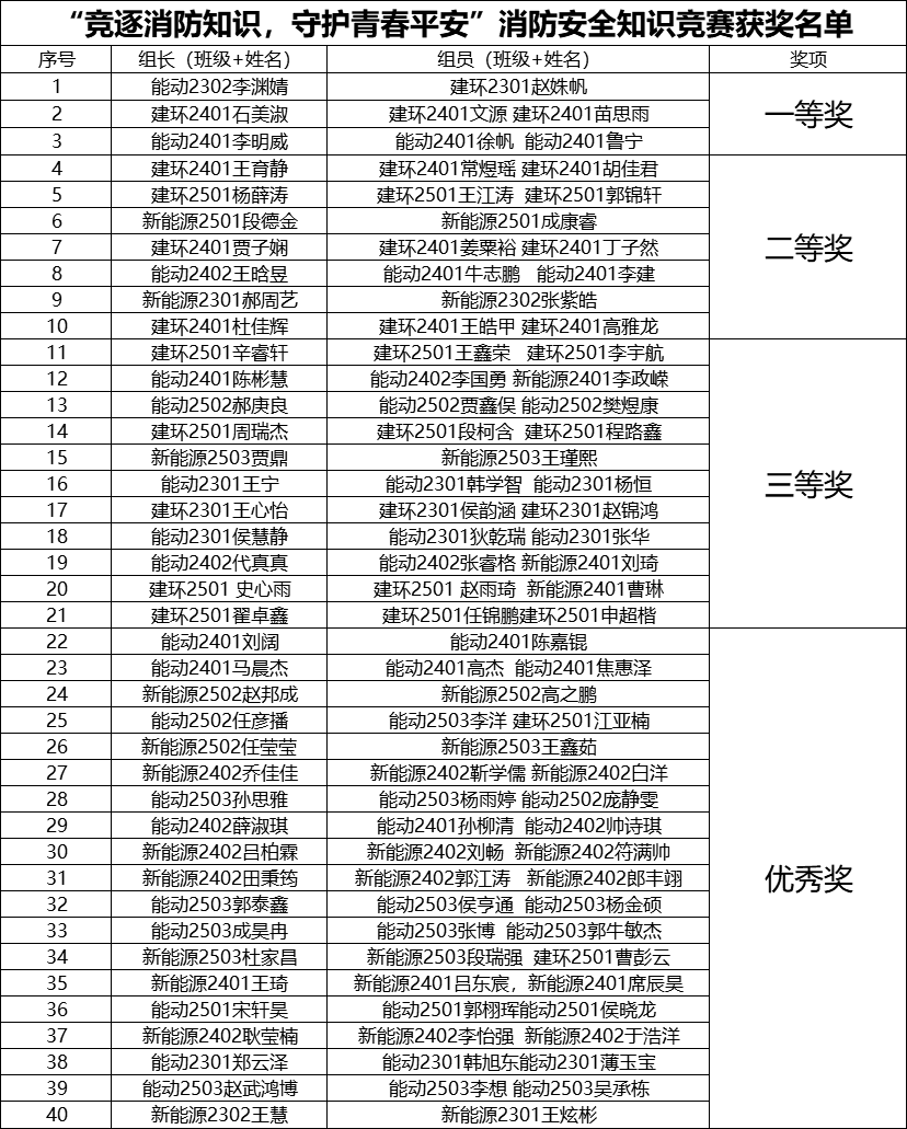 11月恰逢全国消防宣传月,为切实普及校园消防安全知识,强化学生隐患防范意识,全面提升应急处置能力。能源与动力工程系于2025年11月14日举办“竞逐消防知识,守护青春平安”消防安全知识竞赛,以学促行筑牢校园安全防线。